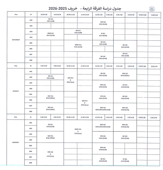 جدول الفرقة الرابعة