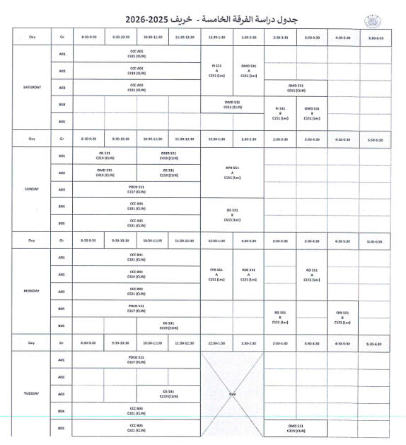 جدول الفرقة الخامسة