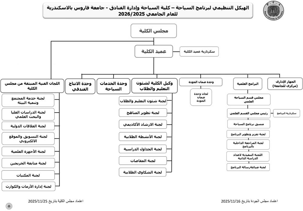يلتزم برنامج السياحة بكلية السياحة وإدارة الفنادق – جامعة فاروس بالإسكندرية – بإعداد كوادر مهنية مؤهله في قطاع السياحة، من خلال تقديم خدمات تعليمية وبحثية متميزة تحقق أهداف التنمية المستدامة، وتوظف التكنولوجيا الحديثة، وتعزز الشراكات الاكاديميه والبحثية والمجتمعية محليًا ودوليًا.
