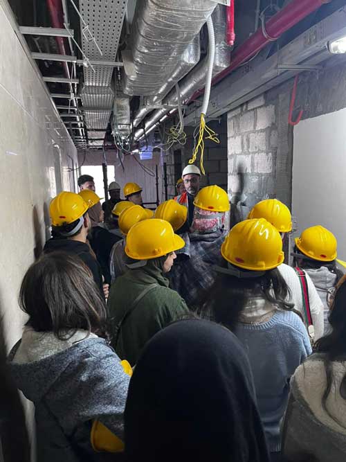 Furthermore, the field tour included a practical demonstration of high-end exterior and interior finishing works. Students closely observed the installation processes for glass curtain walls, false ceilings, and marble cladding, among other intricate executive details. This immersive experience was instrumental in bridging the gap between the theoretical concepts studied in lectures and their real-world applications. By observing various project stages on-site, students developed a profound understanding of the critical relationship between architectural design and the execution process, which is essential for preparing architects capable of translating blueprints into reality with precision and professionalism.