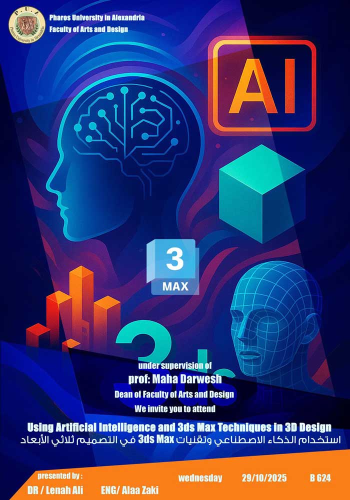 PUA’s Faculty of Arts and Design is highly committed to developing its students’ skills and keeping pace with the latest digital technologies in the fields of creativity and design. Within this context, the Faculty held a distinctive workshop titled “The Use of Artificial Intelligence and 3D Max Techniques in 3D Design”, under the supervision of the Student Activities Administration.