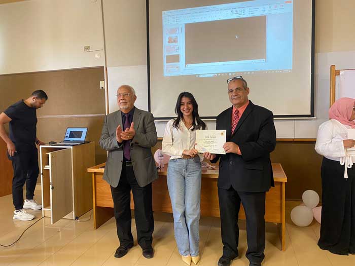 During the seminar, sophomore students from the Medical Laboratories Technology Department presented information to all faculty students on the causes of breast cancer and prevention methods, emphasizing the importance of early detection and its role in increasing recovery rates.