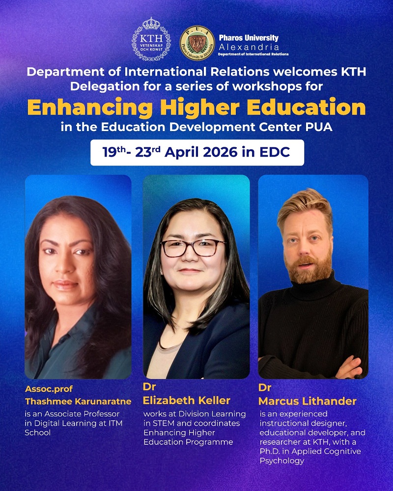 In line with PUA’s goals to enhance innovation in higher education and in line with the continuous cooperation with the International Relations Department, the Education Development Center (EDC) at PUA welcomes a delegation from KTH Royal Institute of Technology, Stockholm, Sweden, to deliver the “Enhancing Higher Education Program” at PUA.