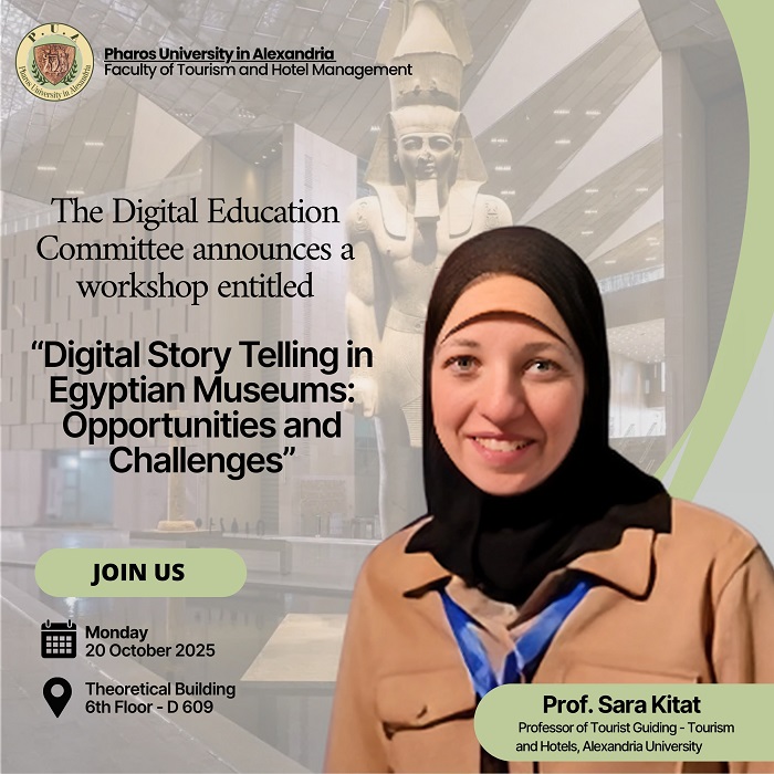 The Digital Education Committee at PUA’s Faculty of Tourism and Hotel Management hosted a workshop titled “Digital Storytelling in Egyptian Museums: Opportunities and Challenges.”