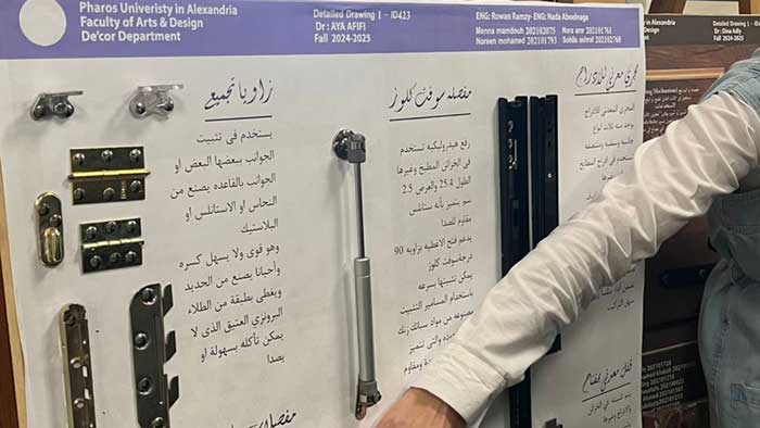The workshop included a detailed explanation by faculty members on door hinges and their installation methods, in addition to the types of wood used in furniture manufacturing and how to select them based on design and function. The workshop also covered practical applications concerning movement mechanisms in the design of beds and movable furniture pieces, thereby enriching students’ applied knowledge.