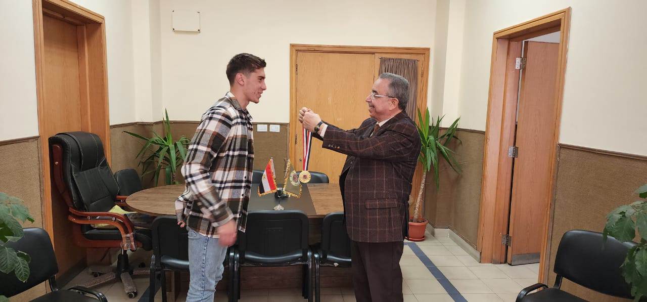 Prof. Dr. Mohamed Etman, Vice President for Community Service and Environmental Development Affairs, welcomed and honored Karim Ahmed Nasser Abdel Moneim Mahmoud, a student at the Faculty of Financial and Administrative Sciences and President of PUA’s Student Union, by awarding him PUA’s Gold Medal. This recognition came in appreciation of Karim’s exceptional athletic achievements at the Alexandria Swimming Championship, where he secured four gold medals (first place in the 50-meter backstroke, first place in the 50-meter backstroke for the general men’s category, first place in the 100-meter backstroke, and first place in the 4×200-meter freestyle relay), one silver medal (second place in the 400-meter freestyle), and three bronze medals (third place in the 200-meter backstroke, third place in the 200-meter freestyle, and third place in the 100-meter backstroke for the general men’s category).