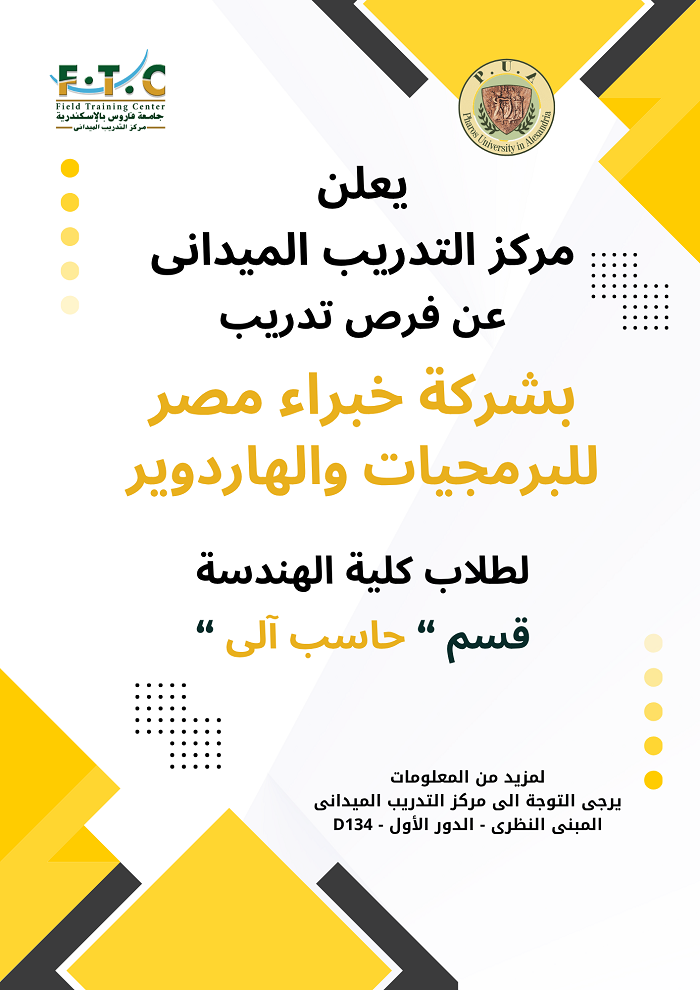 PUA’s Field Training Center is pleased to announce training opportunities for the students of the Computer Engineering Department at the Faculty of Engineering. These training opportunities are offered at Egypt Experts for Software and Hardware Co. For registrations, please visit the Field Training Center at the theoretical building, 1st floor, Room No. D134.